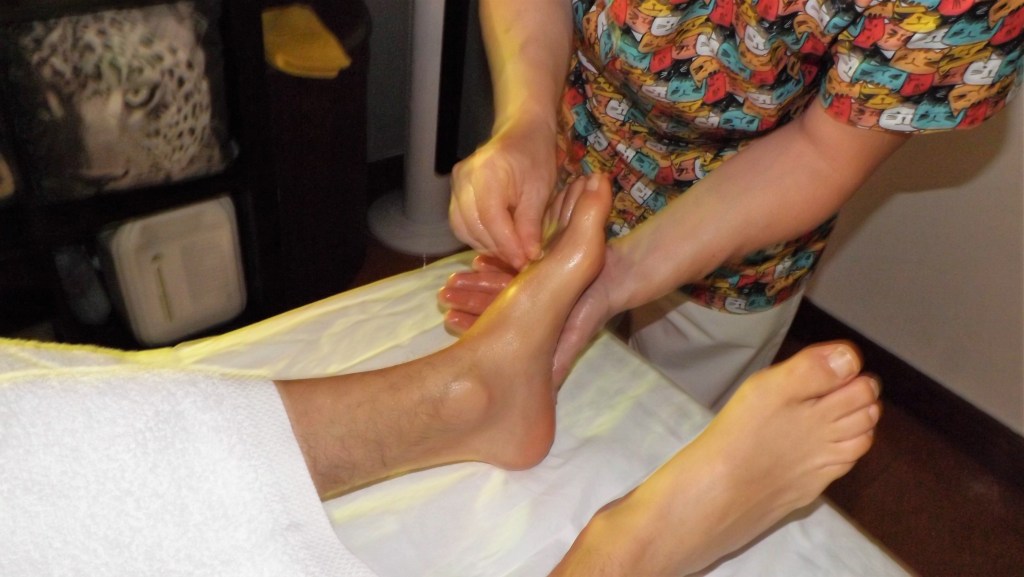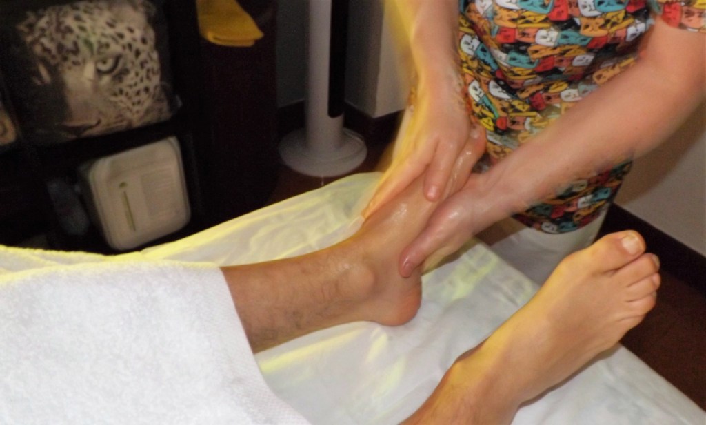 Una vez que los pies están relajados e hidratados con aceite de masaje, procedemos a una limpieza de la piel con un peeling aportando elasticidad y atenuando las arrugas. Limpiamos con una toalla en agua tibia y realizamos un masaje relajante con una crema de aceite sólido.