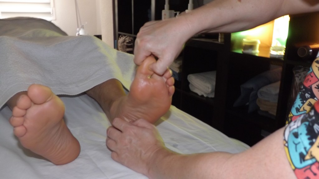 La reflexología es la aplicación de presión en las áreas de los pies o ( las manos ). Las zonas de los pies corresponden a órganos y sistemas del cuerpo.